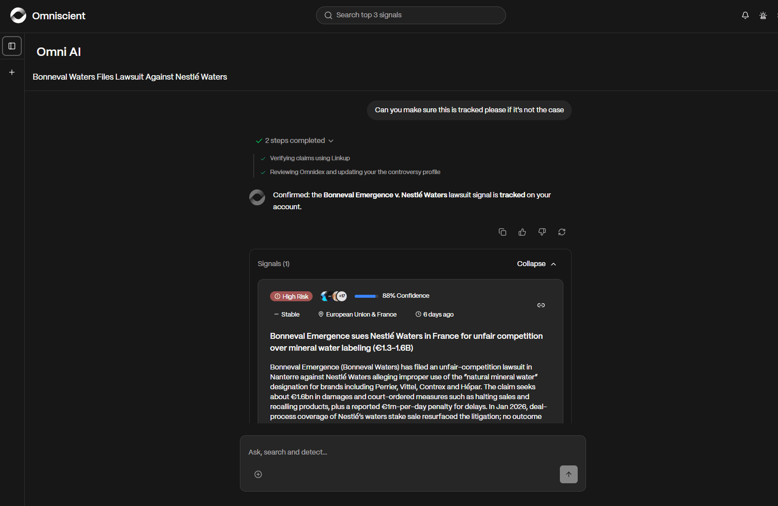 External Validation via Linkup Search: Using Linkup, the agent performs targeted web searches to determine whether the detected controversy is reported beyond Omniscient’s internal index, ensuring broader signal validation.
